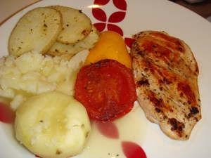 - Transfer the steaks (2 per person) on a plate, putting the veggies on the side and hot mushroom sauce all over the chicken and plate.